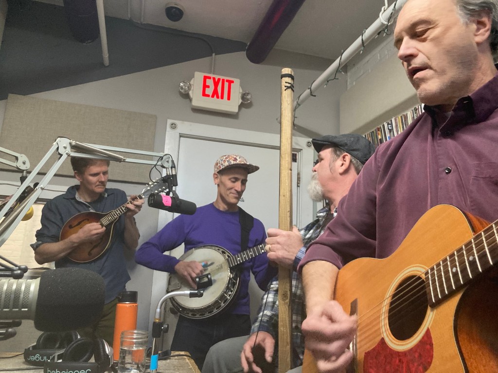 Mill River Rounders joined me in-studio to play a few tunes and preview their upcoming show at Luthiers in Easthampton on November 15. There’s something rare in the music business when folks just play because they love the experience! Picking and singing with friends without industry domination as a goal. That defines these five talented musicians as they genuinely seem to love playing old-time stringband music . The setlist contains traditional tunes and an original, even a request by me. In honor of Day of the Dead, they played “Row Jimmy” to finish after “Georgia Swing”, “Unnamed Road” and “Cindy”.